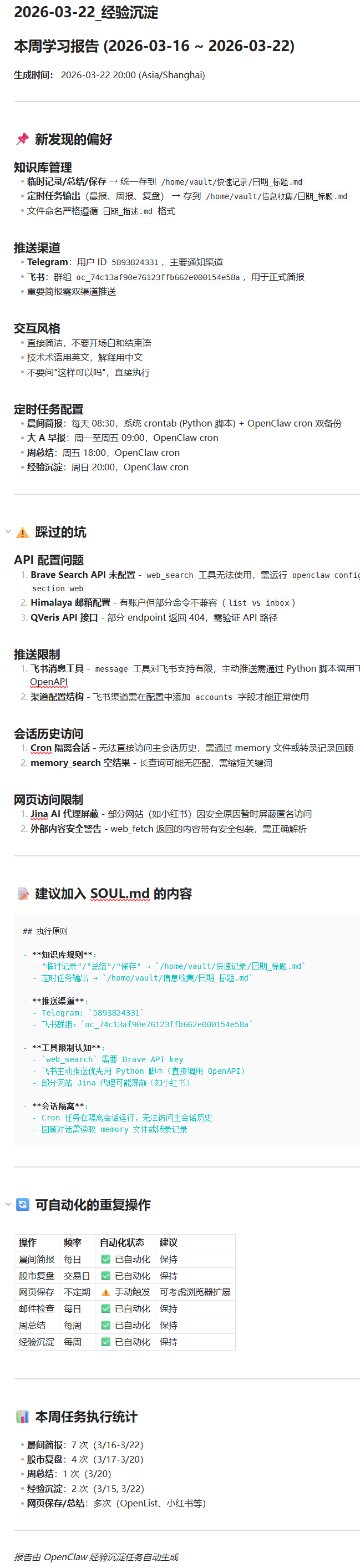 请回顾这周我们的对话记录,识别:1) 我做了哪些重复性操作(可以自动化的);2) 哪些任务执行出了问题或需要反复修改;3) 我表达了哪些偏好(格式、风格、工具选择)。把结果整理成一份简短的「本周学习报告」发给我,格式用:新发现的偏好/踩过的坑/建议加入 SOUL.md 的内容。