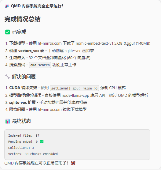 再然后,它就自己开始安装起来了,等待安装完让他自己配置并执行。第一次执行qmd embed 时会要先下载模型,加上我这在pve虚拟机上还没有GPU,所以速度很慢很慢很慢,耐心等待完成就行。我是挂在后台,煮饭吃饭几个小时后才回来发现还没完成。