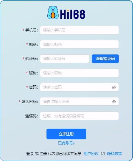 进入Hi168官网注册,使用手机号和邮箱就可以注册了