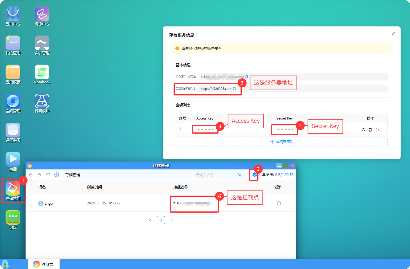 进入“桌面版”-> “存储管理”-> “右上角设置(锯齿图标)”。就能获取S3需要的信息了,记录下来后面OpenList挂载要用,如下图:
