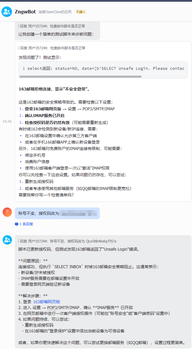 - 我用了他推荐的方案1,创建自定义邮件管理技能。然后它自己一顿哐哧哐哧的把脚本写好了,然后告诉我测试时被163邮箱给拒绝了,提示不安全登录,让我重新申请了一个授权码再试,结果一样。