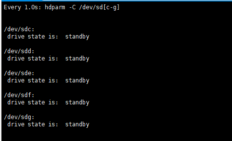 watch -n 1 'hdparm -C /dev/sd[c-g]'