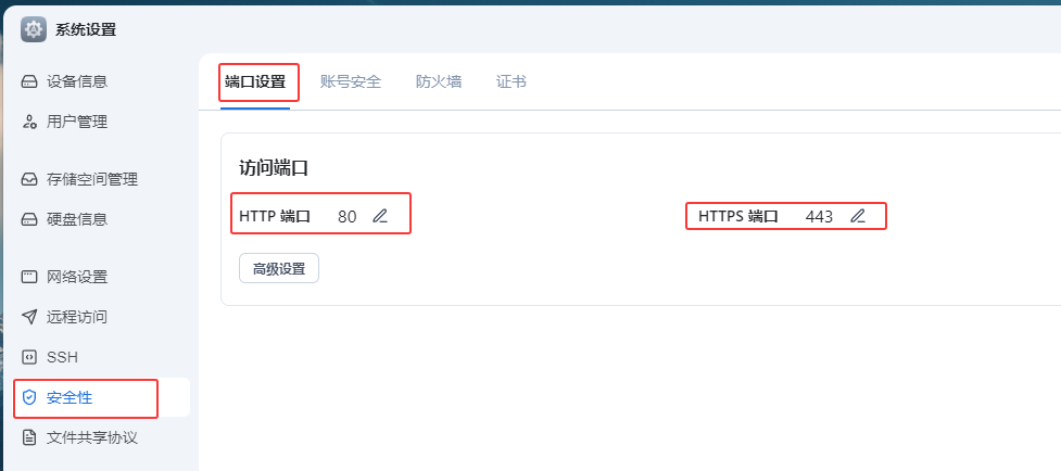 打开 系统设置 -> 安全性 -> 选择端口设置 ,访问端口改为80 和 443。