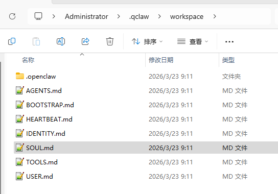 用户/.qclaw目录下,workspace有龙虾八大配置文件,这个文件还是原版英文内容,觉得都已经汉化封装了,就应该换成中文比较合适。