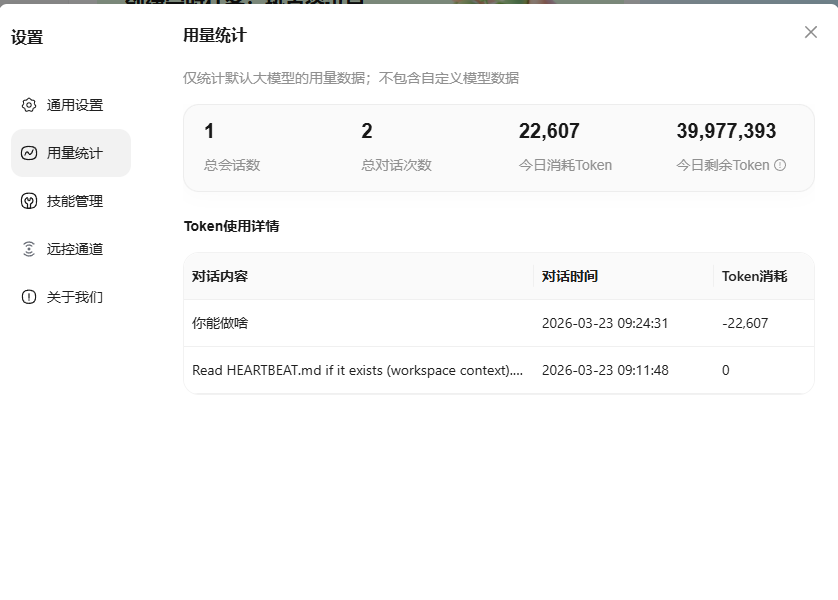 - 大模型默认使用的是腾讯的"qclaw/modelroute"应该是传为QClaw开通的一个接口,具体用了哪个不清楚。每天4000万Token,普通聊天处理点小事基本够用。它还支持国内一些大厂的模型和七大“CodingPlan”计划。缺点是不支持国外的及自定的。