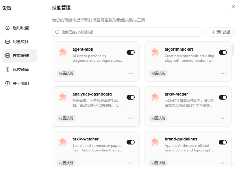 当前可用技能就能显示出来,添加技能可以对话,也可以输入GitHub仓库地址安装,没有clawhub命令行安装了哈。