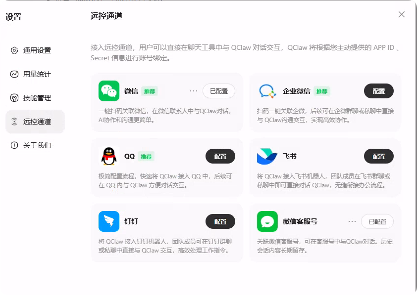 - 远程控制就是Channel,支持国内主流的微信、QQ、飞书、钉钉,这次版本新增了微信,不过手机微信要更新到最新版本才可以。