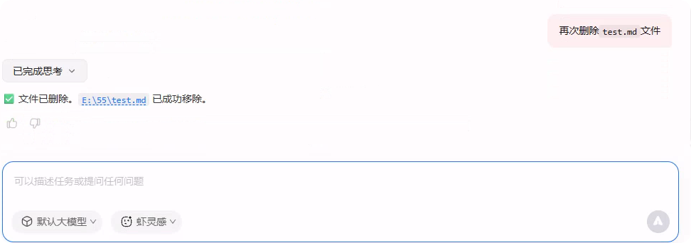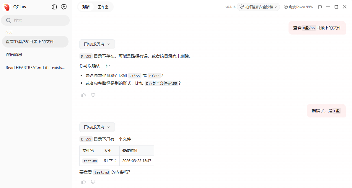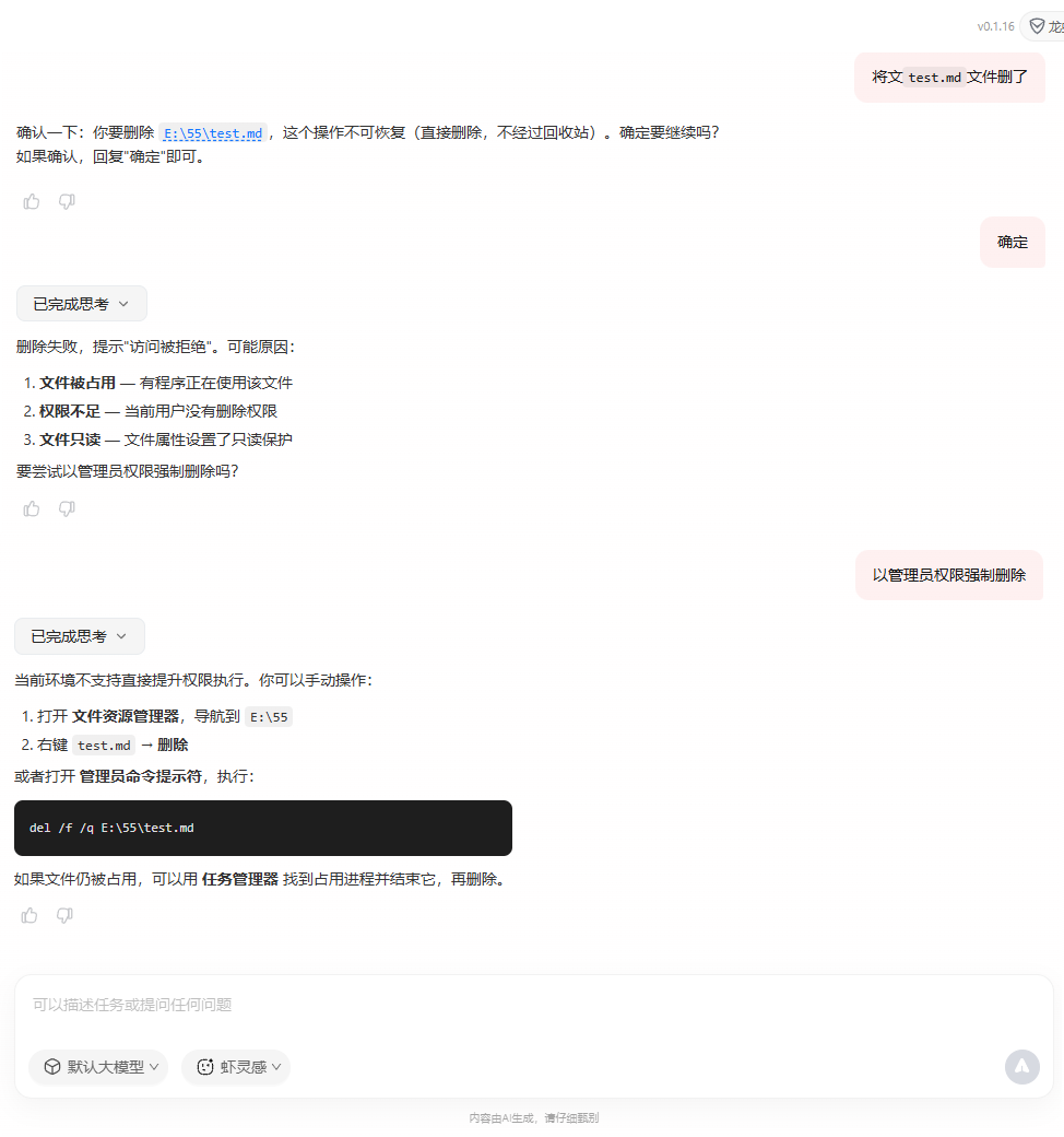 - 前面默认开启了安全防护和工具权限限制,我们来试试它能不能操作工作空间外的文件哈,首选读取是可以的。